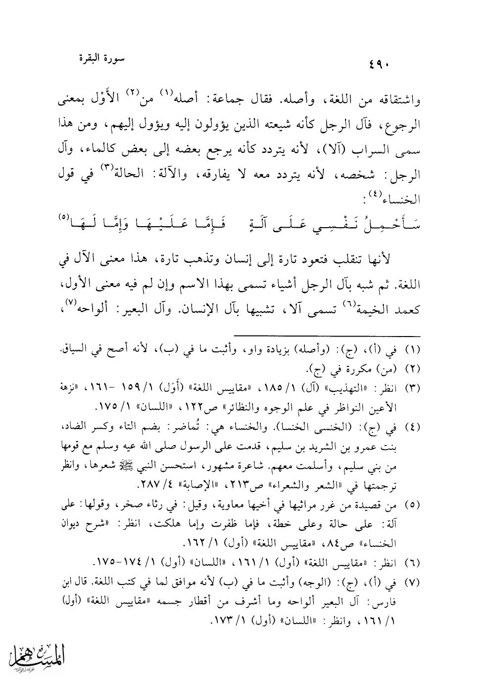 (¬3) انظر: "التهذيب" (آل) 1/ 185، "مقاييس اللغة" (أَوَل) 1/ 159 - 161، "نزهة الأعين النواظر في علم الوجوه والنظائر" ص 122، "اللسان" 1/ 175.