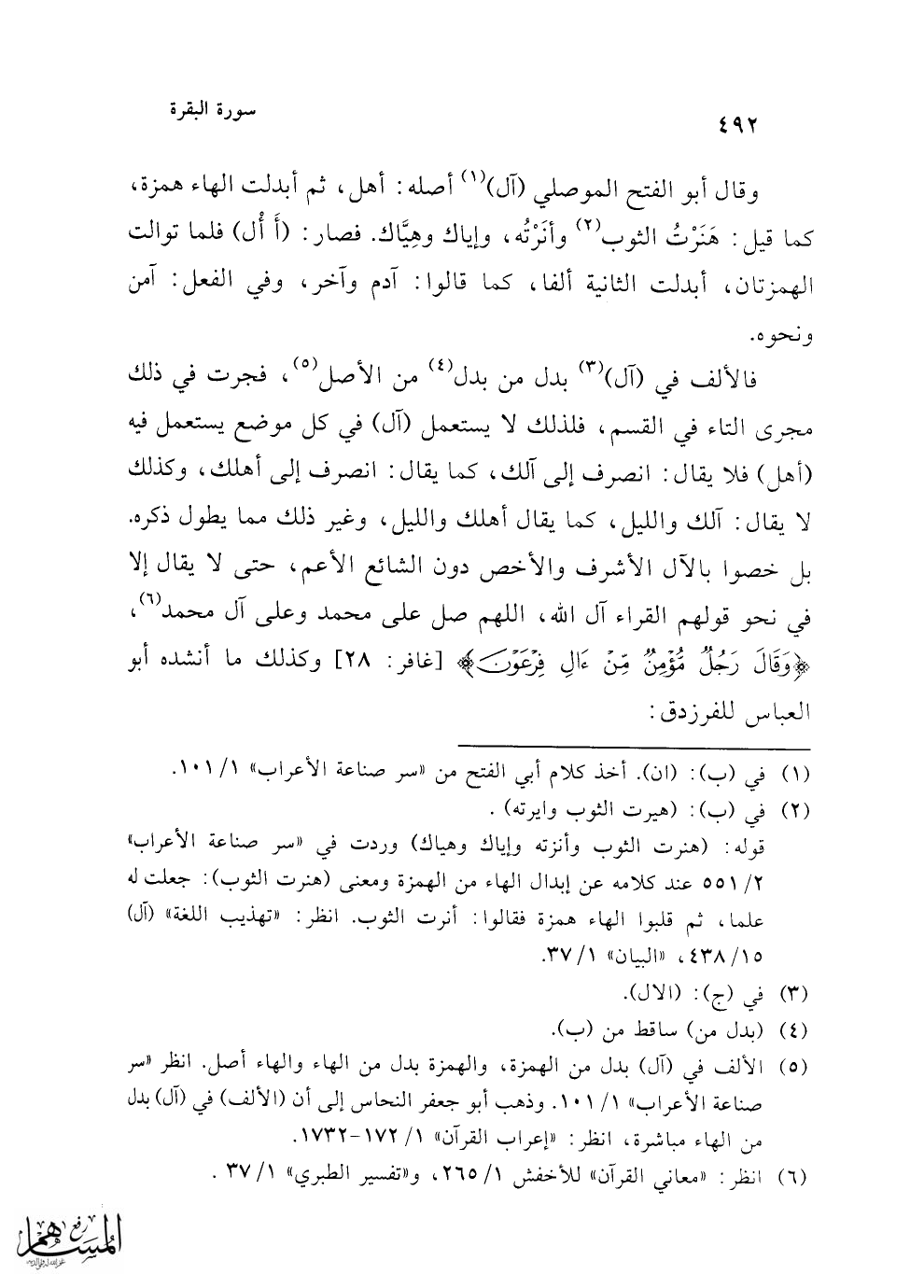 (¬5) الألف في (آل) بدل من الهمزة، والهمزة بدل من الهاء والهاء أصل. انظر "سر صناعة الأعراب" 1/ 101. وذهب أبو جعفر النحاس إلى أن (الألف) في (آل) بدل من الهاء مباشرة، انظر: "إعراب القرآن" 1/ 172 - 1732.