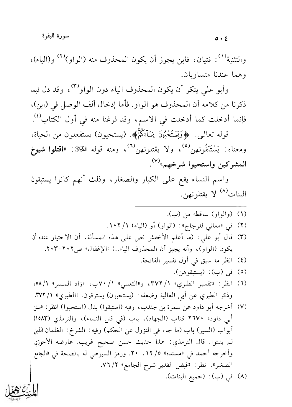 (¬6) انظر: "تفسير الطبري" 1/ 372، و"الثعلبي" 1/ 70 ب، "زاد المسير" 1/ 78، وذكر الطبري عن أبي العالية وضعفه: (يستحيون) يسترقون. "الطبري" 1/ 372.