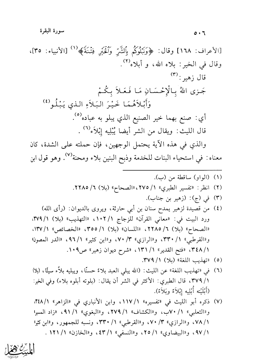 (¬6) في "تهذيب اللغة" عن الليث: (الله يبلى العبد بلاءً حسنًا, ويبليه بلاءً سيئًا, (بلا) 1/ 379, قال الطبري: الأكثر في الشر أن يقال: (بلوته أبلوه بلاء) وفي الخير: (أَبْلَيْته أُبْلِيه إِبْلاَءً وبَلاَءً).