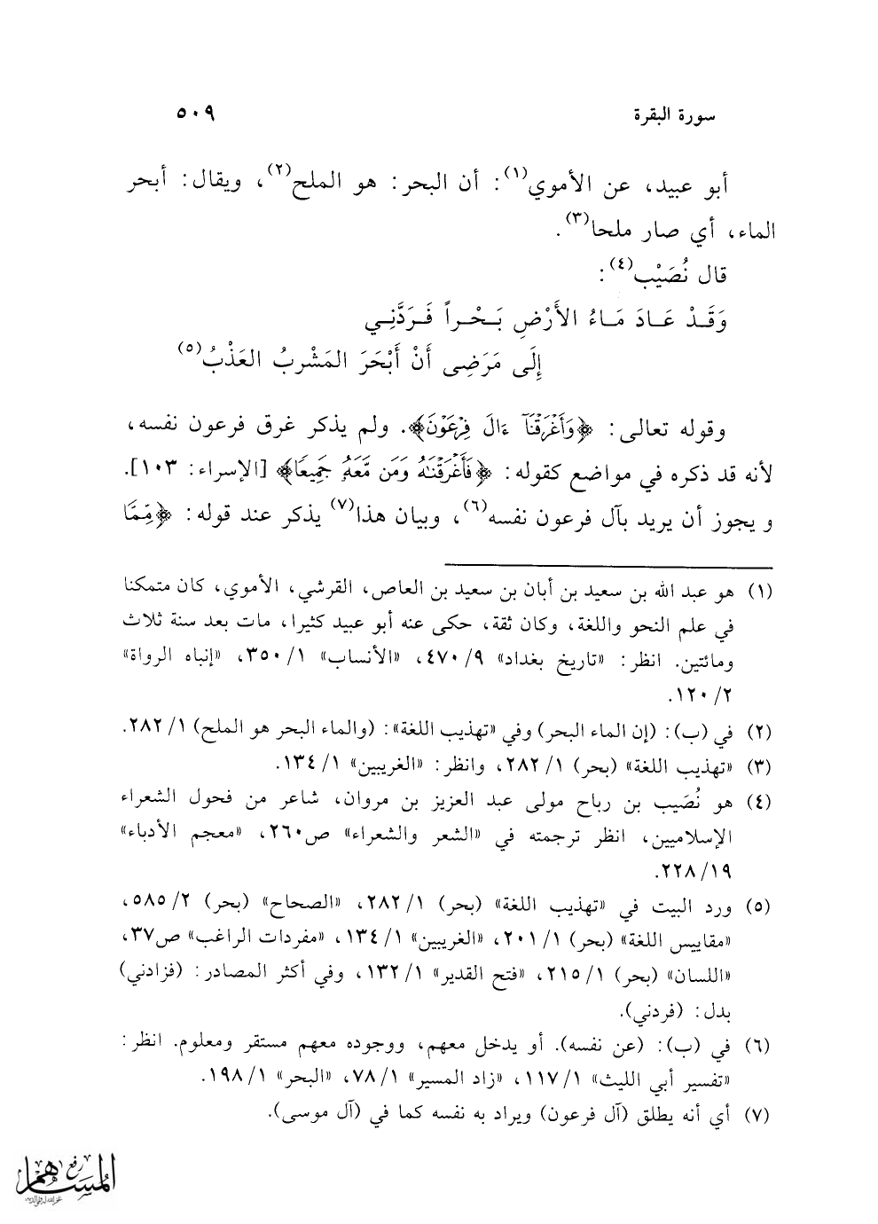 (¬5) ورد البيت في "تهذيب اللغة" (بحر) 1/ 282، "الصحاح" (بحر) 2/ 585، "مقاييس اللغة" (بحر) 1/ 215، "الغريبين" 1/ 134، "مفردات الراغب" ص 37، "اللسان" (بحر) 1/ 215، "فتح القدير" 1/ 132، وفي أكثر المصادر: (فزادني) بدل: (فردني).