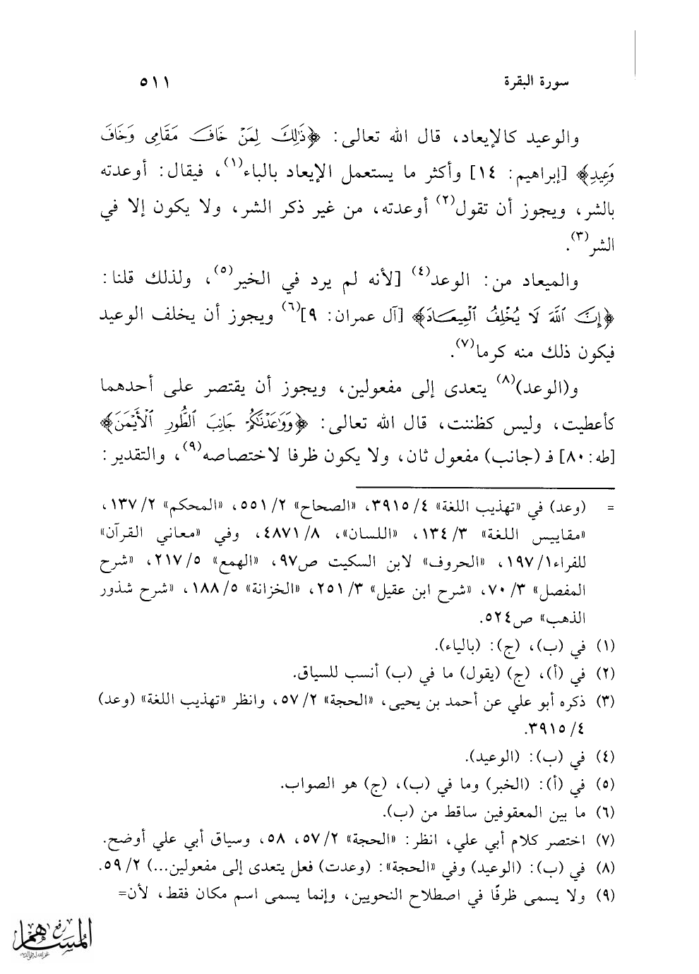 (¬8) في (ب): (الوعيد) وفي "الحجة": (وعدت) فعل يتعدى إلى مفعولين ...) 2/ 59.