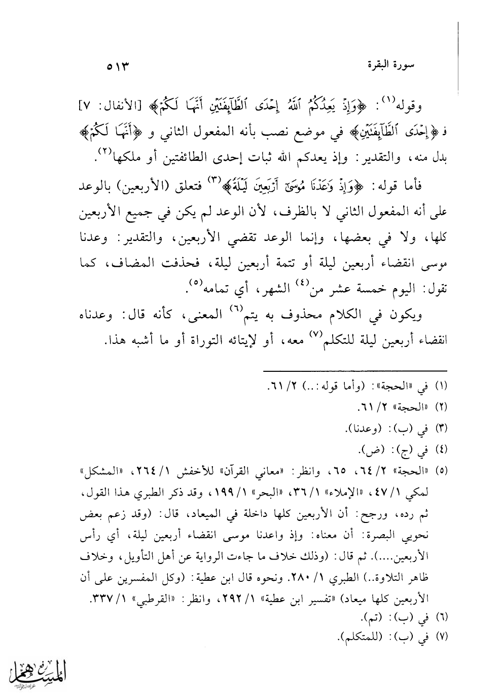 (¬5) "الحجة" 2/ 64، 65، وانظر: "معاني القرآن" للأخفش 1/ 264، "المشكل" لمكي 1/ 47، "الإملاء" 1/ 36، "البحر" 1/ 199، وقد ذكر الطبري هذا القول، ثم رده، ورجح: أن الأربعين كلها داخلة في الميعاد، قال: (وقد زعم بعض نحويي البصرة: أن معناه: وإذ واعدنا موسى انقضاء أربعين ليلة، أي رأس الأربعين ....). ثم قال: (وذلك خلاف ما جاءت الرواية عن أهل التأويل، وخلاف ظاهر التلاوة ..) الطبري 1/ 280. ونحوه قال ابن عطية: (وكل المفسرين على أن الأربعين كلها ميعاد) "تفسير ابن عطية" 1/ 292، وانظر: "القرطبي" 1/ 337.