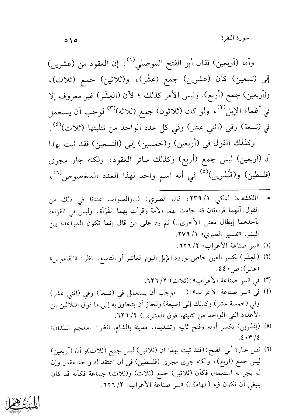 وأما (أربعين) فقال أبو الفتح الموصلي (¬1): إن العقود من (عشرين) إلى (تسعين) كأن (عشرين) جمع (عِشْر)، و (ثلاثين) جمع (ثلاث)، و (أربعين) جمع (أربع). وليس الأمر كذلك؛ لأن (العِشْر) غير معروف إلا في أظماء الإبل (¬2)، ولو كان (ثلاثون) جمع (ثلاثة) (¬3) لوجب أن يستعمل في (تسعة) وفي (اثني عشر) وفي كل عدد الواحد من تثليثها (ثلاث) (¬4).