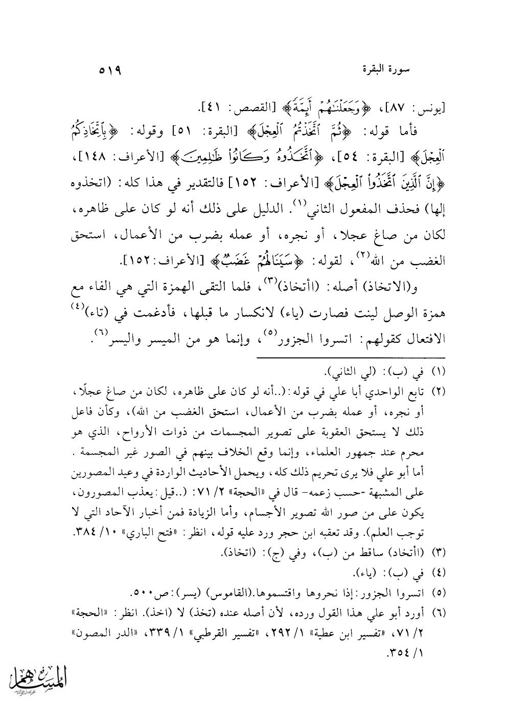 (¬2) تابع الواحدي أبا علي في قوله: (.. أنه لو كان على ظاهره، لكان من صاغ عجلًا، أو نجره، أو عمله بضرب من الأعمال، استحق الغضب من الله)، وكأن فاعل ذلك لا يستحق العقوبة على تصوير المجسمات من ذوات الأرواح، الذي هو محرم عند جمهور العلماء، وإنما وقع الخلاف بينهم في الصور غير المجسمة. أما أبو علي فلا يرى تحريم ذلك كله، ويحمل الأحاديث الواردة في وعيد المصورين على المشبهة -حسب زعمه- قال في "الحجة" 2/ 71: (.. قيل: يعذب المصورون، يكون على من صور الله تصوير الأجسام، وأما الزيادة فمن أخبار الآحاد التي لا توجب العلم). وقد تعقبه ابن حجر ورد عليه قوله، انظر: "فتح الباري" 10/ 384.