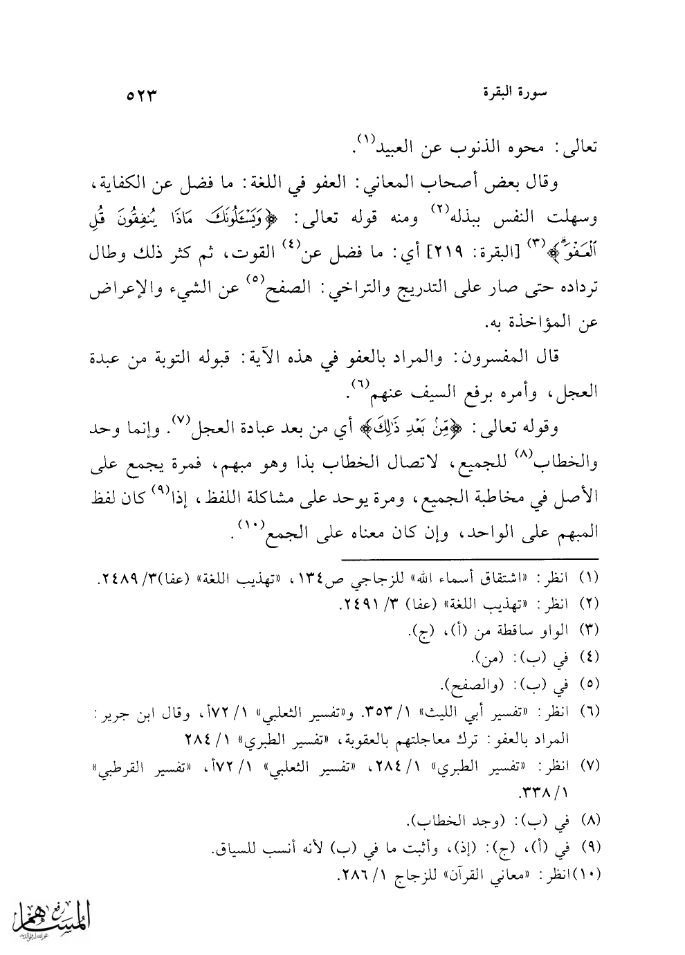 (¬6) انظر: "تفسير أبي الليث" 1/ 353. و"تفسير الثعلبي" 1/ 72 أ، وقال ابن جرير: المراد بالعفو: ترك معاجلتهم بالعقوبة، "تفسير الطبري" 1/ 284.
