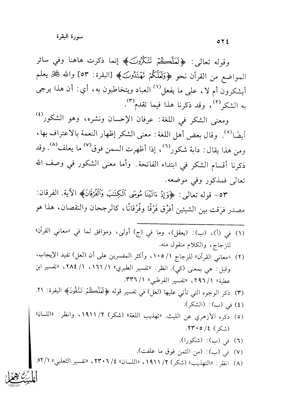 (¬8) انظر: "التهذيب" (شكر) 2/ 1911، "اللسان" 4/ 2306، "تفسير الثعلبي" 1/ 72.