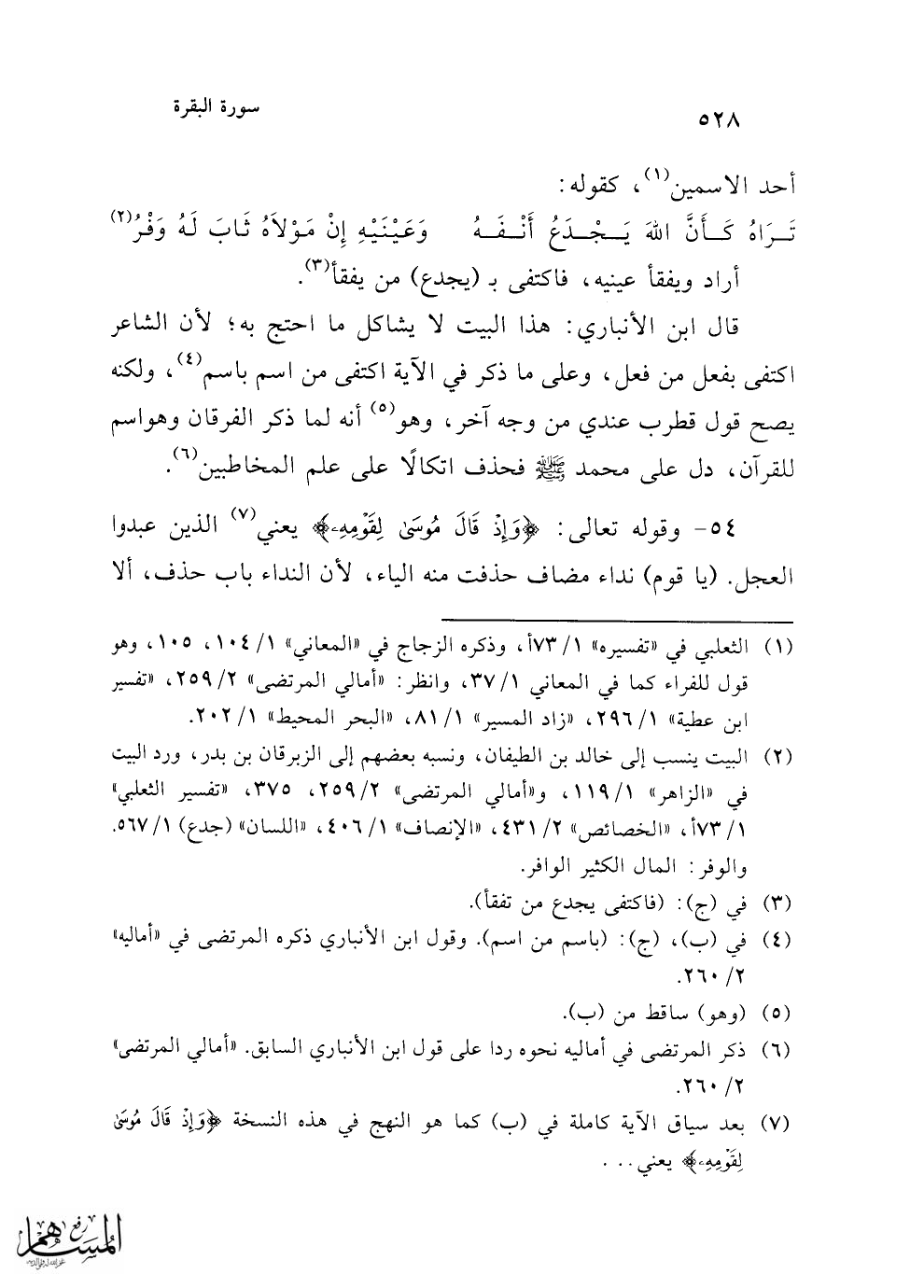 (¬6) ذكر المرتضى في أماليه نحوه ردا على قول ابن الأنباري السابق. "أمالي المرتضى" 2/ 260.