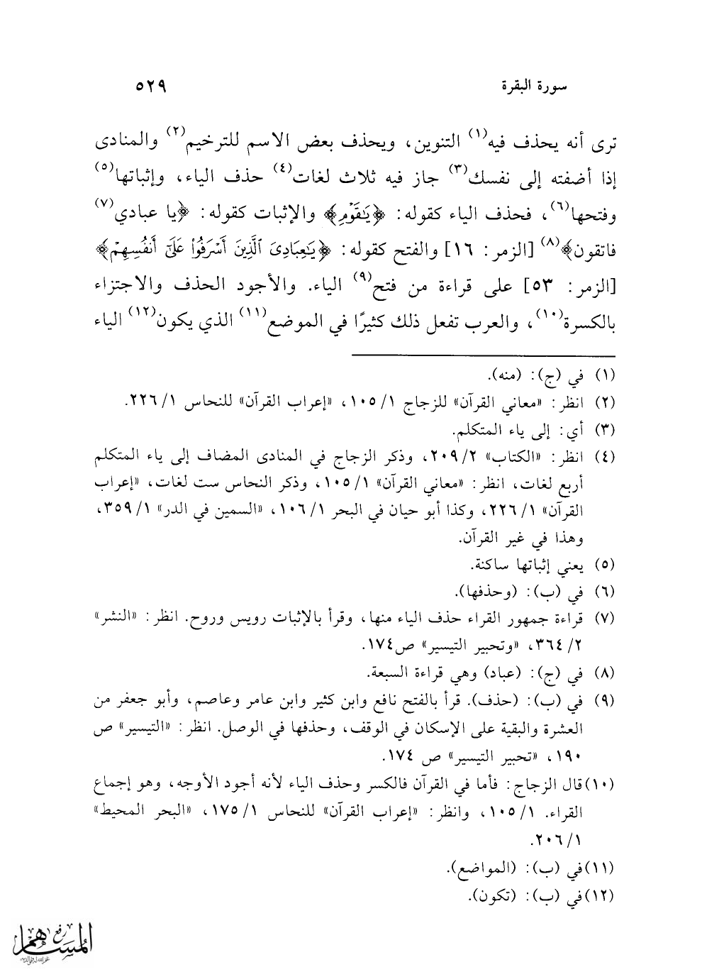 (¬10) قال الزجاج: فأما في القرآن فالكسر وحذف الياء لأنه أجود الأوجه، وهو إجماع القراء 1/ 105، وانظر: "إعراب القرآن" للنحاس 1/ 175، "البحر المحيط" 1/ 206.