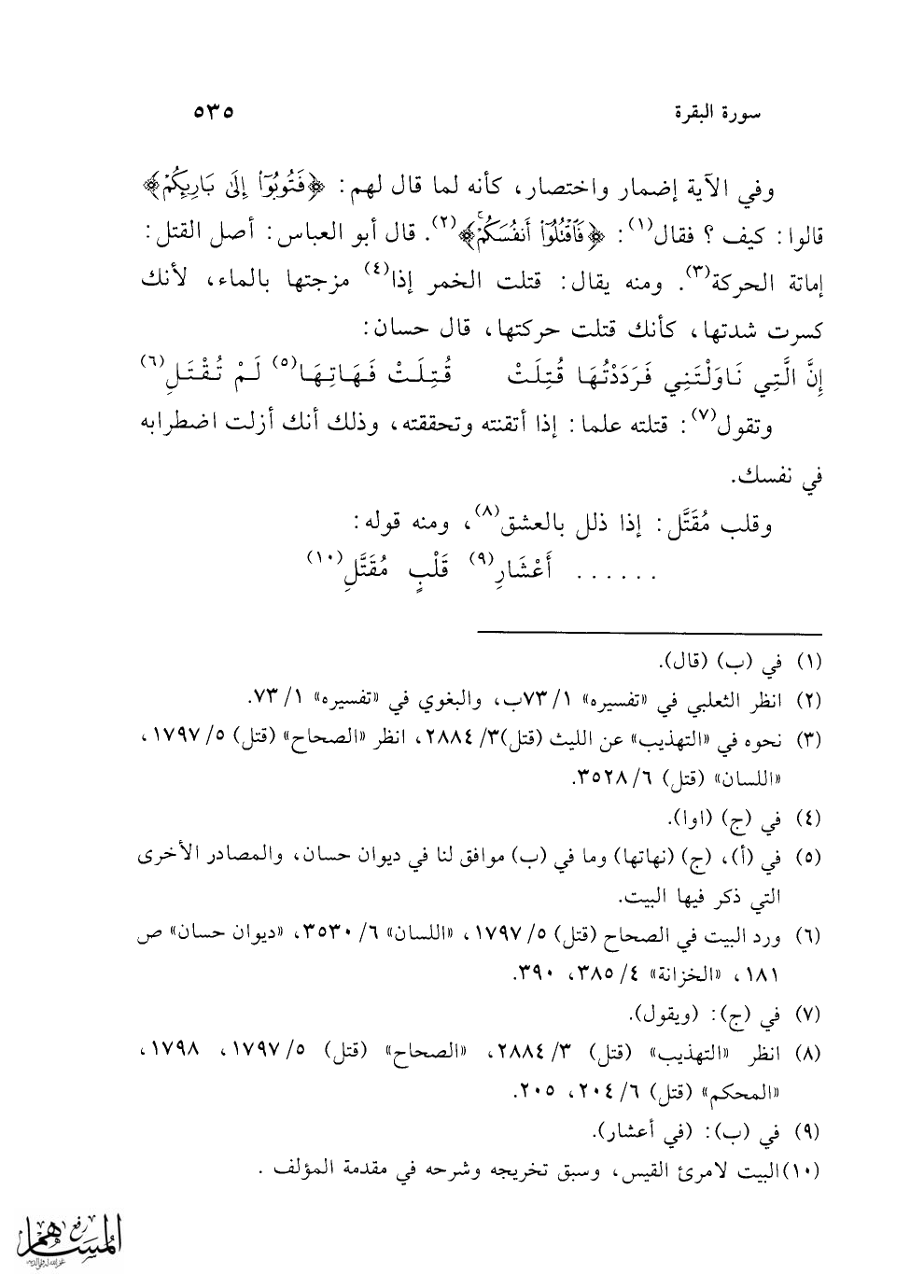 وفي الآية إضمار واختصار، كأنه لما قال لهم: {فَتُوبُوا إِلَى بَارِئِكُمْ} قالوا: كيف؟ فقال (¬1): {فَاقْتُلُوا أَنْفُسَكُمْ} (¬2). قال أبو العباس: أصل القتل: إماتة الحركة (¬3). ومنه يقال: قتلت الخمر إذا (¬4) مزجتها بالماء، لأنك كسرت شدتها، كأنك قتلت حركتها، قال حسان: