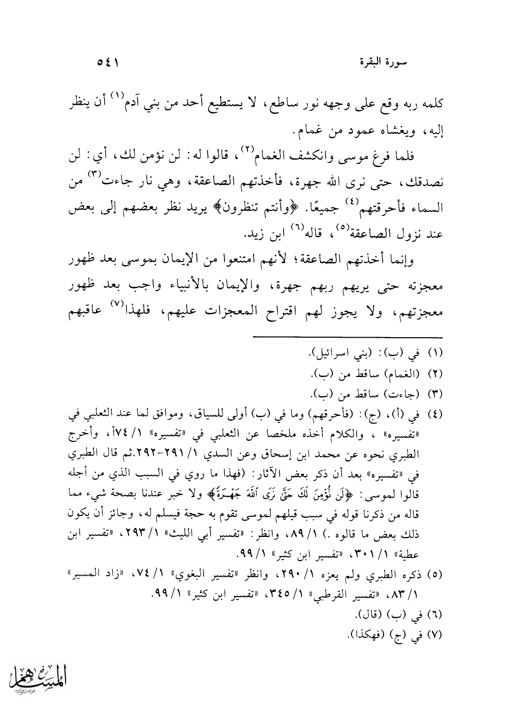 (¬4) في (أ)، (ج): (فأحرقهم) وما في (ب) أولى للسياق، وموافق لما عند الثعلبي في "تفسيره"، والكلام أخذه ملخصا عن الثعلبي في "تفسيره" 1/ 74 أ، وأخرج الطبري نحوه عن محمد ابن إسحاق وعن السدي 1/ 291 - 292. ثم قال الطبري في "تفسيره" بعد أن ذكر بعض الآثار: (فهذا ما روي في السبب الذي من أجله قالوا لموسى: {لَنْ نُؤْمِنَ لَكَ حَتَّى نَرَى اللَّهَ جَهْرَةً} ولا خبر عندنا بصحة شيء مما قاله من ذكرنا قوله في سبب قيلهم لموسى تقوم به حجة فيسلم له، وجائز أن يكون ذلك بعض ما قالوه ..) 1/ 89، وانظر: "تفسير أبي الليث" 1/ 293، "تفسير ابن عطية" 1/ 301، "تفسير ابن كثير" 1/ 99.