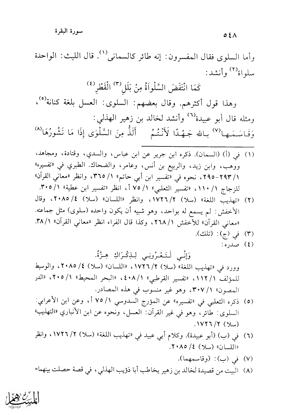 وهذا قول أكثرهم. وقال بعضهم: السلوى: العسل بلغة كنانة (¬5)، ومثله قال أبو عبيدة (¬6) وأنشد لخالد بن زهير الهذلي: