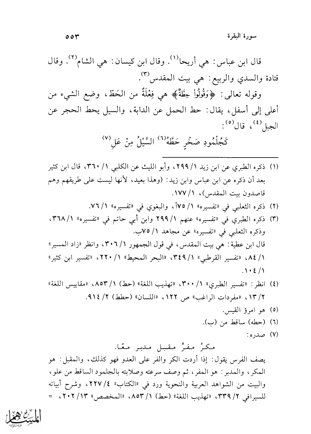 (¬4) انظر: "تفسير الطبري" 1/ 300، "تهذيب اللغة" (حط) 1/ 853، "مقاييس اللغة" 2/ 13، "مفردات الراغب" ص 122، "اللسان" (حطط) 2/ 914.