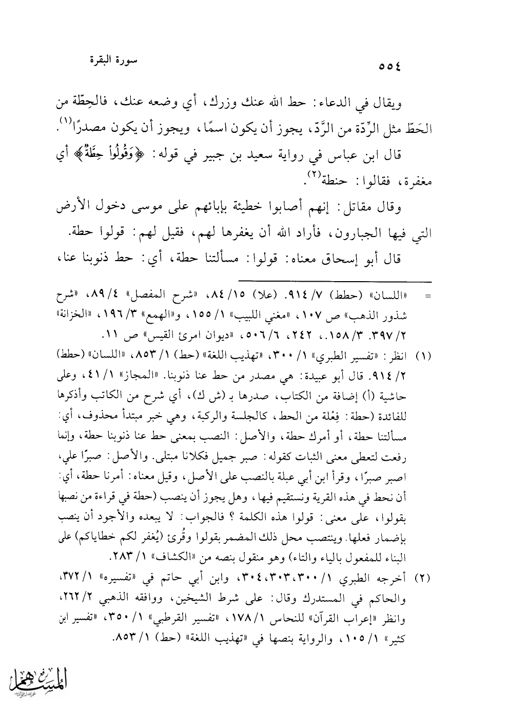 (¬2) أخرجه الطبري 1/ 300، 303، 304، وابن أبي حاتم في "تفسيره" 1/ 372، والحاكم في المستدرك وقال: على شرط الشيخين، ووافقه الذهبي 2/ 262، وانظر "إعراب القرآن" للنحاس 1/ 178، "تفسير القرطبي" 1/ 350، "تفسير ابن كثير" 1/ 105، والرواية بنصها في "تهذيب اللغة" (حط) 1/ 853.