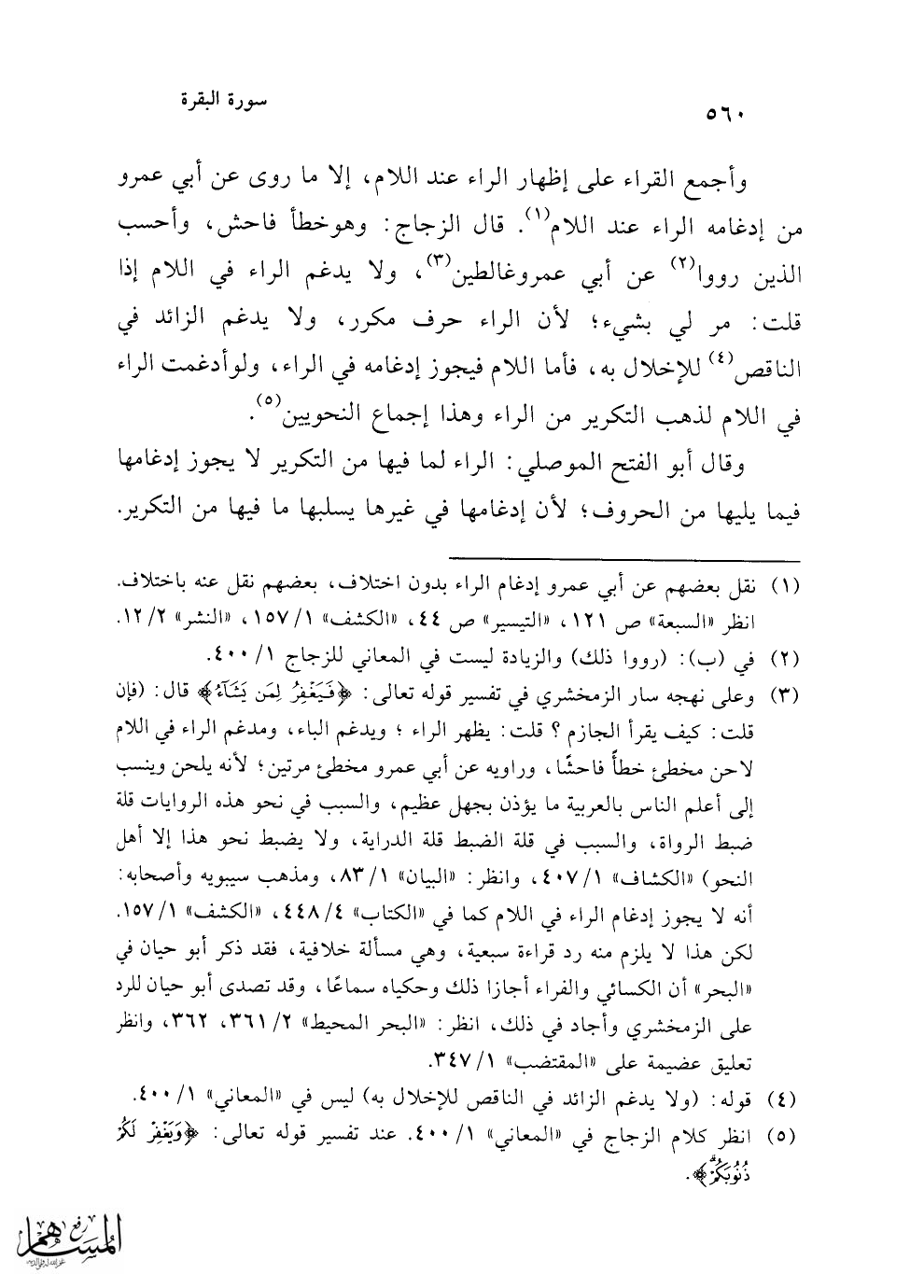 (¬1) نقل بعضهم عن أبي عمرو إدغام الراء بدون اختلاف، بعضهم نقل عنه باختلاف. انظر "السبعة" ص 121، "التيسير" ص 44، "الكشف" 1/ 157، "النشر" 2/ 12.
