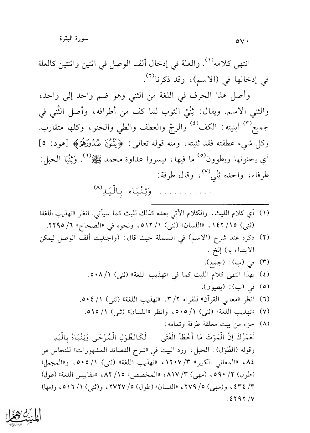 (¬4) بهذا انتهى كلام الليث كما في "تهذيب اللغة" (ثنى) 1/ 508.