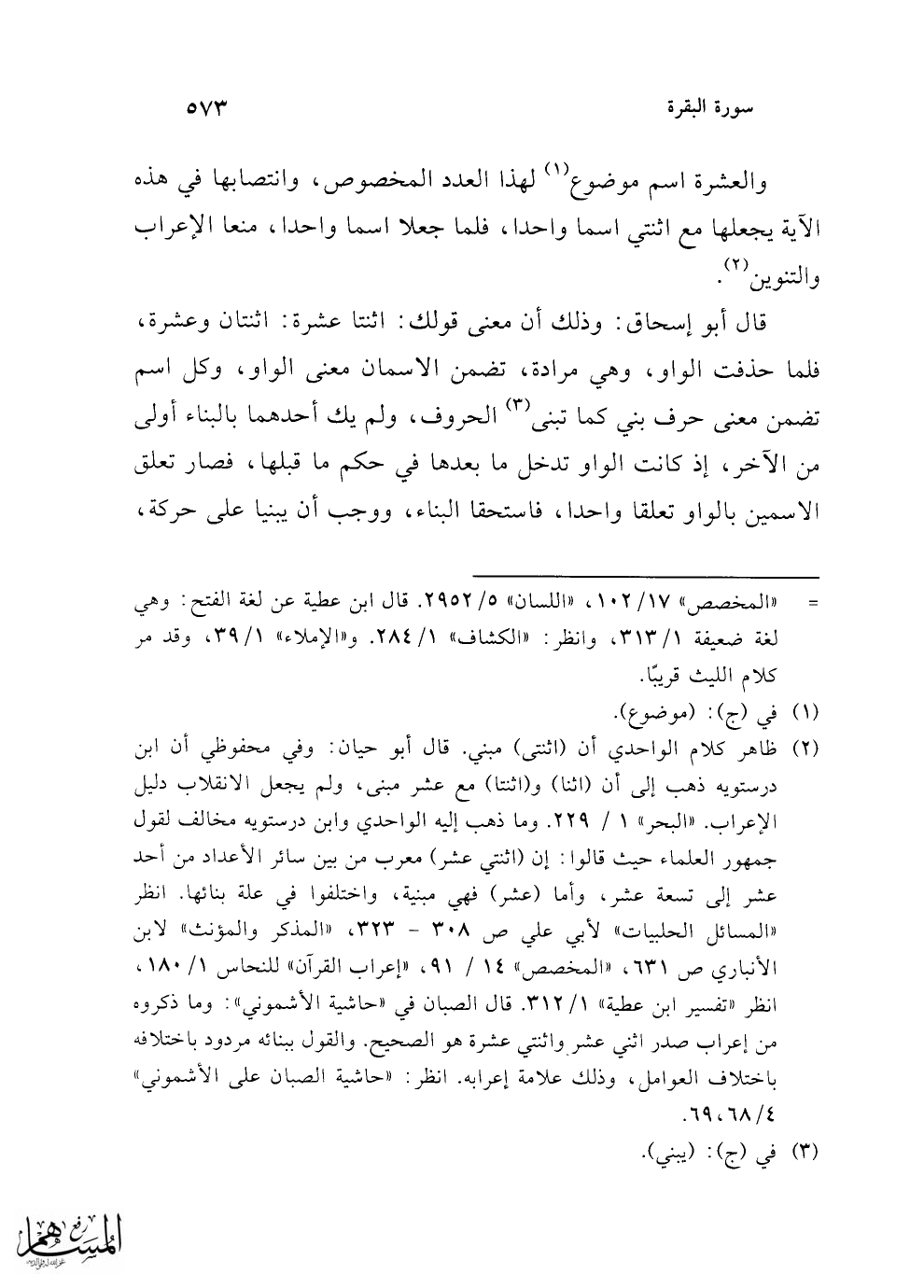 (¬2) ظاهر كلام الواحدي أن (اثنتى) مبني. قال أبو حيان: وفي محفوظي أن ابن درستويه ذهب إلى أن (اثنا) و (اثنتا) مع عشر مبنى، ولم يجعل الانقلاب دليل الإعراب. "البحر" 1/ 229. وما ذهب إليه الواحدي وابن درستويه مخالف لقول جمهور العلماء حيث قالوا: إن (اثنتي عشر) معرب من بين سائر الأعداد من أحد عشر إلى تسعة عشر، وأما (عشر) فهي مبنية، واختلفوا في علة بنائها. انظر "المسائل الحلبيات" لأبي علي ص 308 - 323، "المذكر والمؤنث" لابن الأنباري ص631، "المخصص" 14/ 91، "إعراب القرآن" للنحاس 1/ 180، انظر "تفسير ابن عطية" 1/ 312. قال الصبان في "حاشية الأشموني": وما ذكروه من إعراب صدر اثني عشر واثنتي عشرة هو الصحيح. والقول ببنائه مردود باختلافه باختلاف العوامل، وذلك علامة إعرابه. انظر: "حاشية الصبان على الأشموني" 4/ 68، 69.