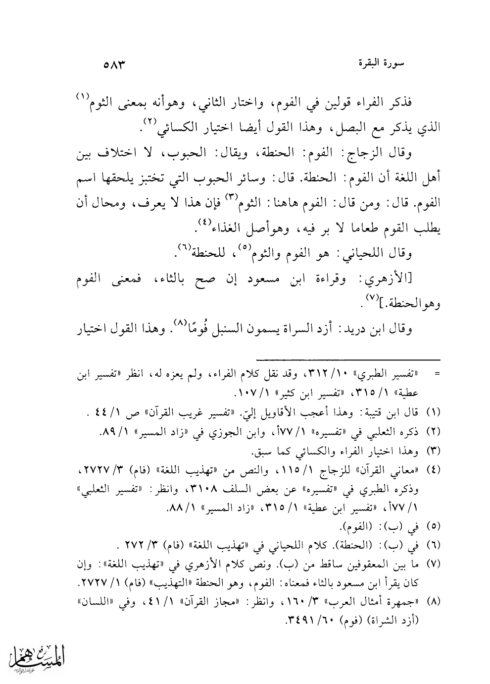 (¬7) ما بين المعقوفين ساقط من (ب). ونص كلام الأزهري في "تهذيب اللغة": وإن كان يقرأ ابن مسعود بالثاء فمعناه: الفوم، وهو الحنطة "التهذيب" (فام) 1/ 2727.