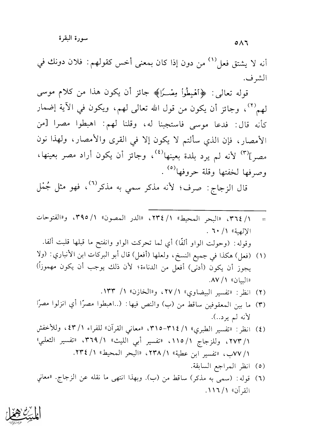 (¬3) ما بين المعقوفين ساقط من (ب) والنص فيها: (.. اهبطوا مصرًا أي انزلوا مصرا لأنه لم يرد ..).