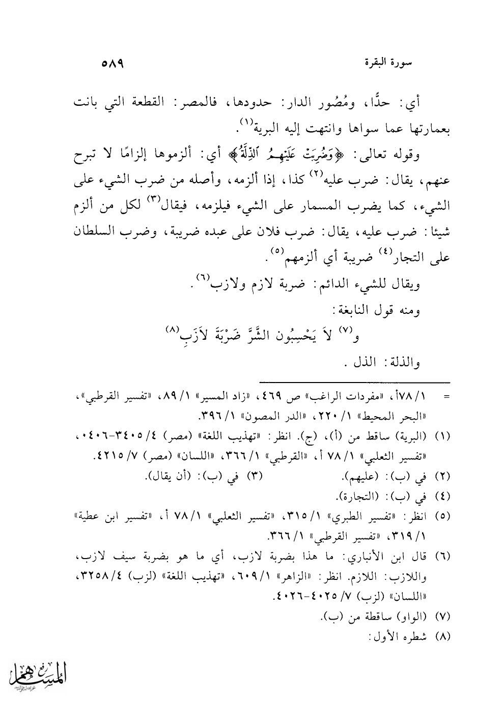 = 1/ 78 أ، "مفردات الراغب" ص 469، "زاد المسير" 1/ 89، "تفسير القرطبي"، "البحر المحيط" 1/ 220، "الدر المصون" 1/ 396.