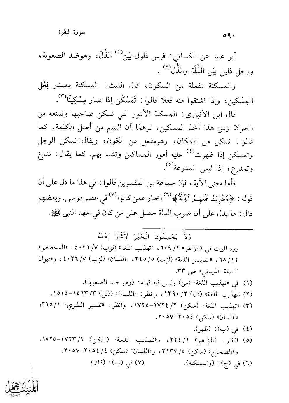 (¬3) "تهذيب اللغة" (سكن) 2/ 1724 - 1725، وانظر: "تفسير الطبري" 1/ 315، "اللسان" (سكن) 2054 - 2057.