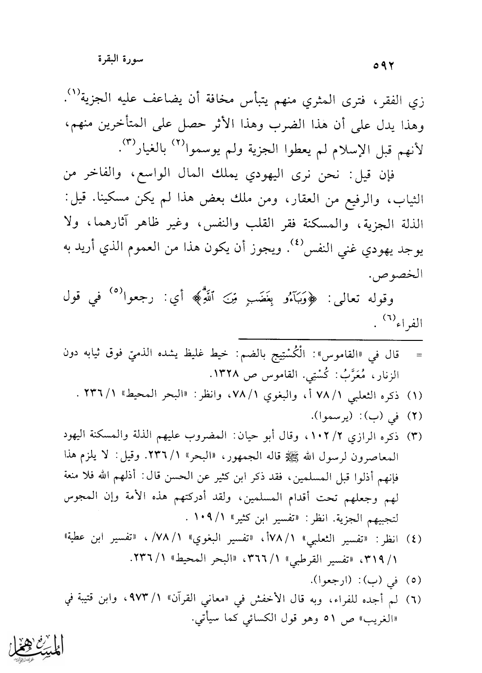 (¬4) انظر: "تفسير الثعلبي" 1/ 78 أ، "تفسير البغوي" 1/ 78/، "تفسير ابن عطية" 1/ 319، "تفسير القرطبي" 1/ 366، "البحر المحيط" 1/ 236.