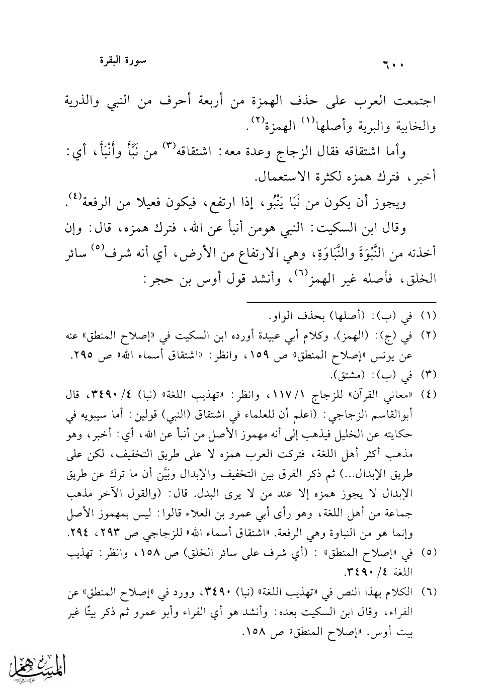 (¬4) "معاني القرآن" للزجاج 1/ 117، وانظر: "تهذيب اللغة" (نبا) 4/ 3490، قال أبو القاسم الزجاجي: (اعلم أن للعلماء في اشتقاق (النبي) قولين: أما سيبويه في حكايته عن الخليل فيذهب إلى أنه مهموز الأصل من أنبأ عن الله، أي: أخبر، وهو مذهب أكثر أهل اللغة، فتركت العرب همزه لا على طريق التخفيف، لكن على طريق الإبدال ...) ثم ذكر الفرق بين التخفيف والإبدال وبَيَّن أن ما ترك عن طريق الإبدال لا يجوز همزه إلا عند من لا يرى البدل. قال: (والقول الآخر مذهب جماعة من أهل اللغة، وهو رأى أبي عمرو بن العلاء قالوا: ليس بمهموز الأصل وإنما هو من النباوة وهي الرفعة. "اشتقاق أسماء الله" للزجاجي ص 293، 294.