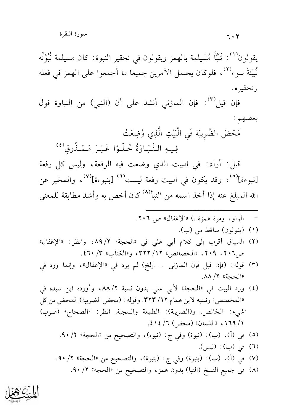 (¬2) السياق أقرب إلى كلام أبي علي في "الحجة" 2/ 89، وانظر: "الإغفال" ص206،209، "الخصائص" 12/ 322، و"الكتاب" 3/ 460.