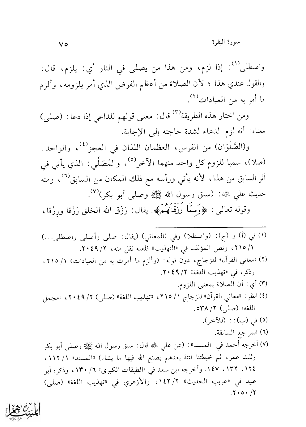 (¬4) انظر. "معاني القرآن" للزجاج 1/ 215، "تهذيب اللغة" (صلى) 2/ 2049، "مجمل اللغة" (صلى) 2/ 538.