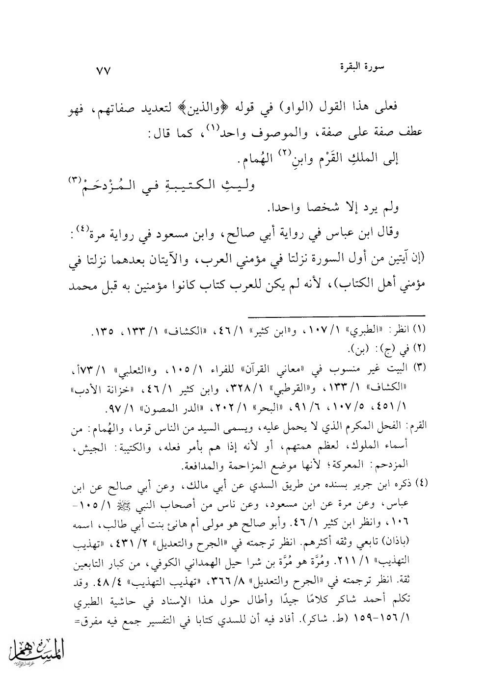 (¬1) انظر: "الطبري" 1/ 107، و"ابن كثير" 1/ 46، "الكشاف" 1/ 133، 135.