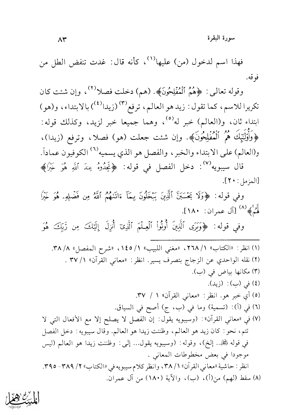 (¬7) في "معاني القرآن": (وسيبويه يقول: إن الفصل لا يصلح إلا مع الأفعال التي لا تتم، نحو: كان زيد هو العالم، وظننت زيدا هو العالم. وقال سيبويه. دخل الفصل في قوله عز وجل .. إلخ)، وقوله: (وسيبويه يقول ... إلى: وظننت زيدا هو العالم (ليس موجودا في بعض مخطوطات المعاني.