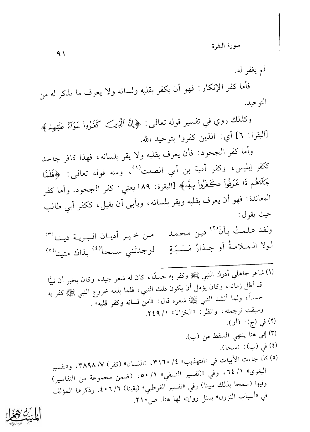 (¬5) كذا جاءت الأبيات في "التهذيب" 4/ 3160، "اللسان" (كفر) 7/ 3898، و"تفسير البغوي" 1/ 64، وفي "تفسير النسفي" 1/ 50، (ضمن مجموعة من التفاسير) وفيها (سمحا بذلك مبينا) وفي "تفسير القرطبي" (بقينا) 6/ 406. وذكرها المؤلف في "أسباب النزول" بمثل روايته لها هنا. ص 210.