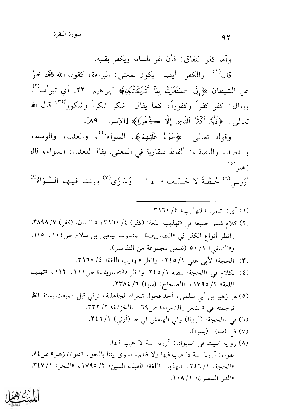 (¬2) كلام شمر جميعه في "تهذيب اللغة" (كفر) 4/ 3160، "اللسان" (كفر) 7/ 3898، وانظر أنواع الكفر في "التصاريف" المنسوب ليحيى بن سلام ص 104، 105، و"النسفي" 1/ 50 (ضمن مجموعة من التفاسير).