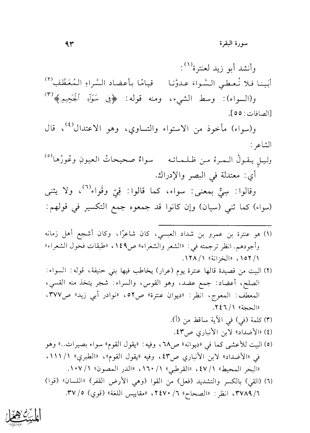 (¬2) البيت من قصيدة قالها عنترة يوم (عرار) يخاطب فيها بني حنيفة، قوله: السواء: الصلح، أعضاد: جمع عضد، وهو القوس، والسراء: شجر يتخذ منه القسي، المعطف: المعوج، انظر. "ديوان عنترة" ص 52، "نوادر أبي زيد" ص 377، "الحجة" 1/ 246.