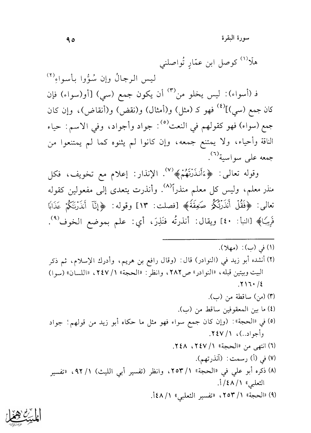 (¬8) ذكره أبو علي في "الحجة" 1/ 253، وانظر (تفسير أبي الليث) 1/ 92، "تفسير الثعلبي" 1/ 48/أ.