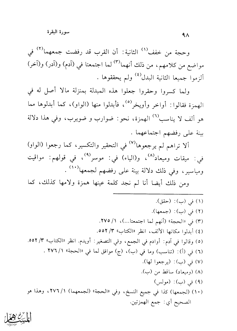 (¬10) (لجمعها) كذا في جميع النسخ، وفي "الحجة" (لجمعهما) 1/ 276، وهذا هو الصحيح أي: جمع الهمزتين.