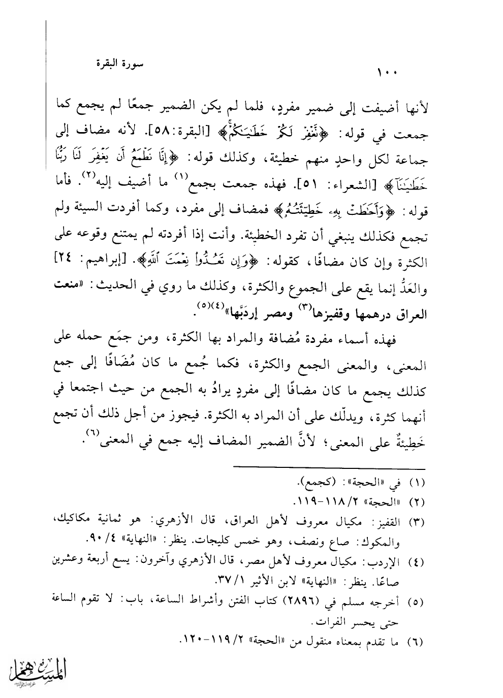 فهذه أسماء مفردة مُضافة والمراد بها الكثرة، ومن جمَع حمله على المعنى، والمعنى الجمع والكثرة، فكما جُمع ما كان مُضَافًا إلى جمع كذلك يجمع ما كان مضافًا إلى مفردٍ يرادُ به الجمع من حيث اجتمعا في أنهما كثرة، ويدلّك على أن المراد به الكثرة. فيجوز من أجل ذلك أن تجمع خَطِيئةٌ على المعنى؛ لأنَّ الضمير المضاف إليه جمع في المعنى (¬6).