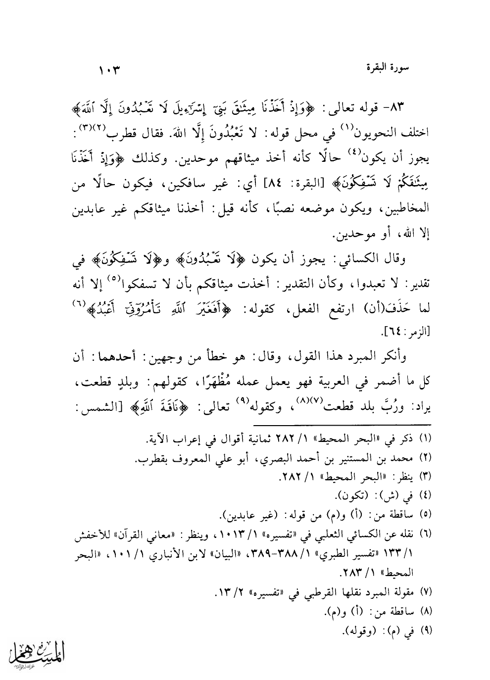 83 - قوله تعالى: {وَإِذْ أَخَذْنَا مِيثَاقَ بَنِي إِسْرَائِيلَ لَا تَعْبُدُونَ إِلَّا اللَّهَ} اختلف النحويون (¬1) في محل قوله: لا تَعْبُدُونَ إِلَّا اللهَ. فقال قطرب (¬2) (¬3): يجوز أن يكون (¬4) حالًا كأنه أخذ ميثاقهم موحدين. وكذلك {وَإِذْ أَخَذْنَا مِيثَاقَكُمْ لَا تَسْفِكُونَ} [البقرة: 84] أي: غير سافكين، فيكون حالًا من المخاطبين، ويكون موضعه نصبًا، كأنه قيل: أخذنا ميثاقكم غير عابدين إلا الله، أو موحدين.