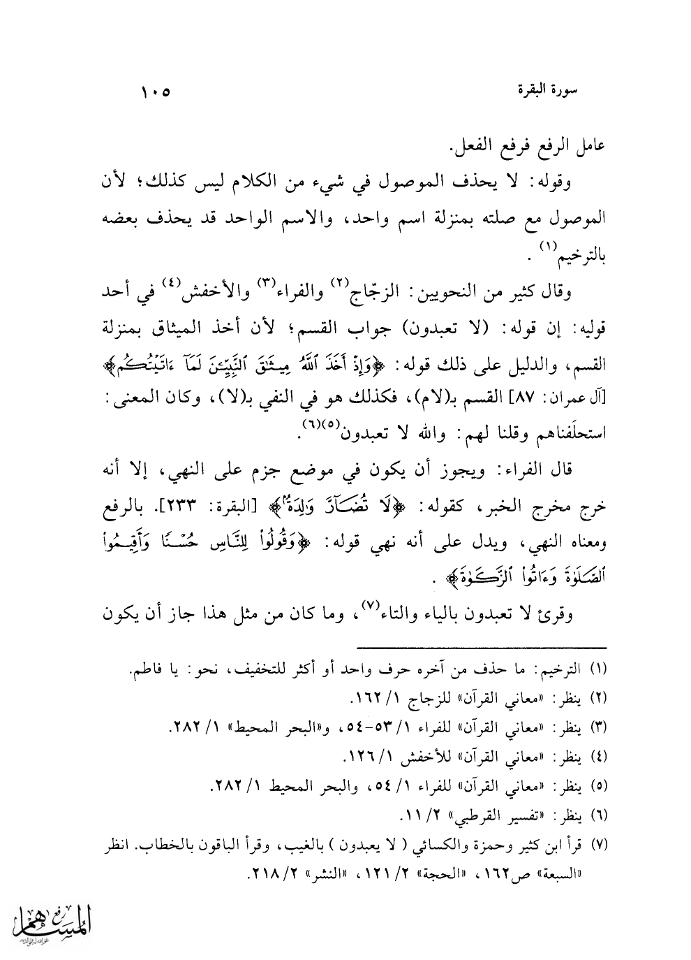 (¬5) ينظر: "معاني القرآن" للفراء 1/ 54، والبحر المحيط 1/ 282.
