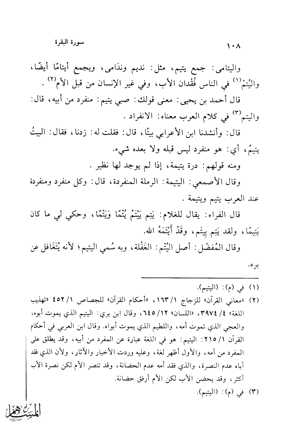 (¬2) "معاني القرآن" للزجاج 1/ 163، "أحكام القرآن" للجصاص 1/ 452 "تهذيب اللغة" 4/ 3974، "اللسان" 12/ 645، وقال ابن بري: اليتيم الذي يموت أبوه، والعجي الذي تموت أمه، واللطيم الذي يموت أبواه. وقال ابن العربي في أحكام القرآن 1/ 215: اليتيم: هو في اللغة عبارة عن المفرد من أبيه، وقد يطلق على المفرد من أمه، والأول أظهر لغة، وعليه وردت الأخبار والآثار، ولأن الذي فقد أباه عدم النصرة، والذي فقد أمه عدم الحضانة، وقد تنصر الأم لكن نصرة الأب أكثر، وقد يحضن الأب لكن الأم أرفق حضانة.