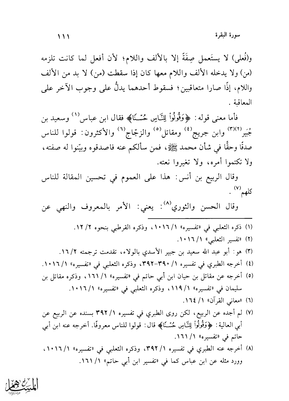 (¬7) لم أجده عن الربيع، لكن روى الطبري في تفسيره 1/ 392 بسنده عن الربيع عن أبي العالية: {وَقُولُوا لِلنَّاسِ حُسْنًا} قال: قولوا للناس معروفا. أخرجه عنه ابن أبي حاتم في "تفسيره" 1/ 161.