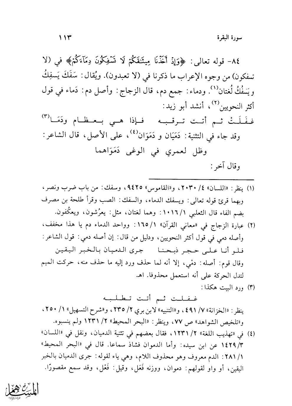 84 - قوله تعالى: {وَإِذْ أَخَذْنَا مِيثَاقَكُمْ لَا تَسْفِكُونَ دِمَاءَكُمْ} في (لا تسفكون) من وجوه الإعراب ما ذكرنا في (لا تعبدون). ويُقال: سَفَكَ يَسفِكُ ويَسفُكُ لُغتان (¬1). ودماء: جمع دم، قال الزجاج: وأصل دم: دَماء في قول أكثر النحويين (¬2)، أنشد أبو زيد: