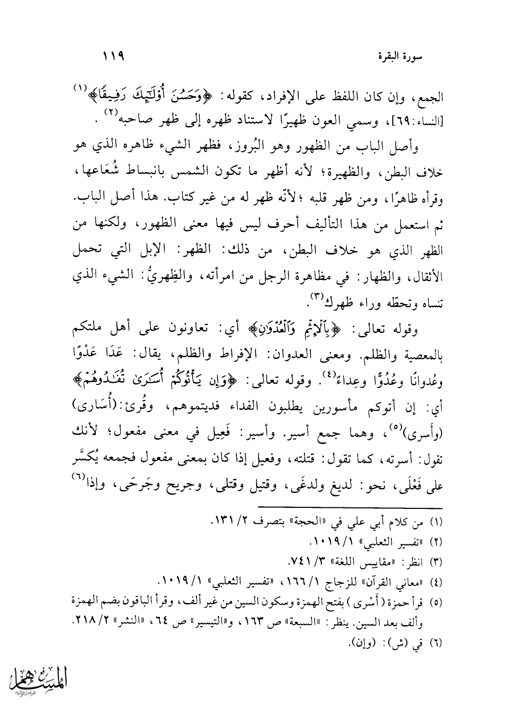 وقوله تعالى: {بِالْإِثْمِ وَالْعُدْوَانِ} أي: تعاونون على أهل ملتكم بالمعصية والظلم. ومعنى العدوان: الإفراط والظلم، يقال: عَدَا عَدْوًا وعُدوانًا وعُدُوًّا وعِداءً (¬4). وقوله تعالى: {وَإِنْ يَأْتُوكُمْ أُسَارَى تُفَادُوهُمْ} أي: إن أتوكم مأسورين يطلبون الفداء فديتموهم، وقُرئ: (أُسَارى) (وأَسرى) (¬5)، وهما جمع أسير. وأسير: فَعِيل في معنى مفعول؛ لأنك تقول: أسرته، كما تقول: قتلته، وفعيل إذا كان بمعنى مفعول فجمعه يُكسَّر على فَعْلَى، نحو: لديغ ولدغَى، وقتيل وقتلى، وجريح وجَرحَى، وإذا (¬6)
