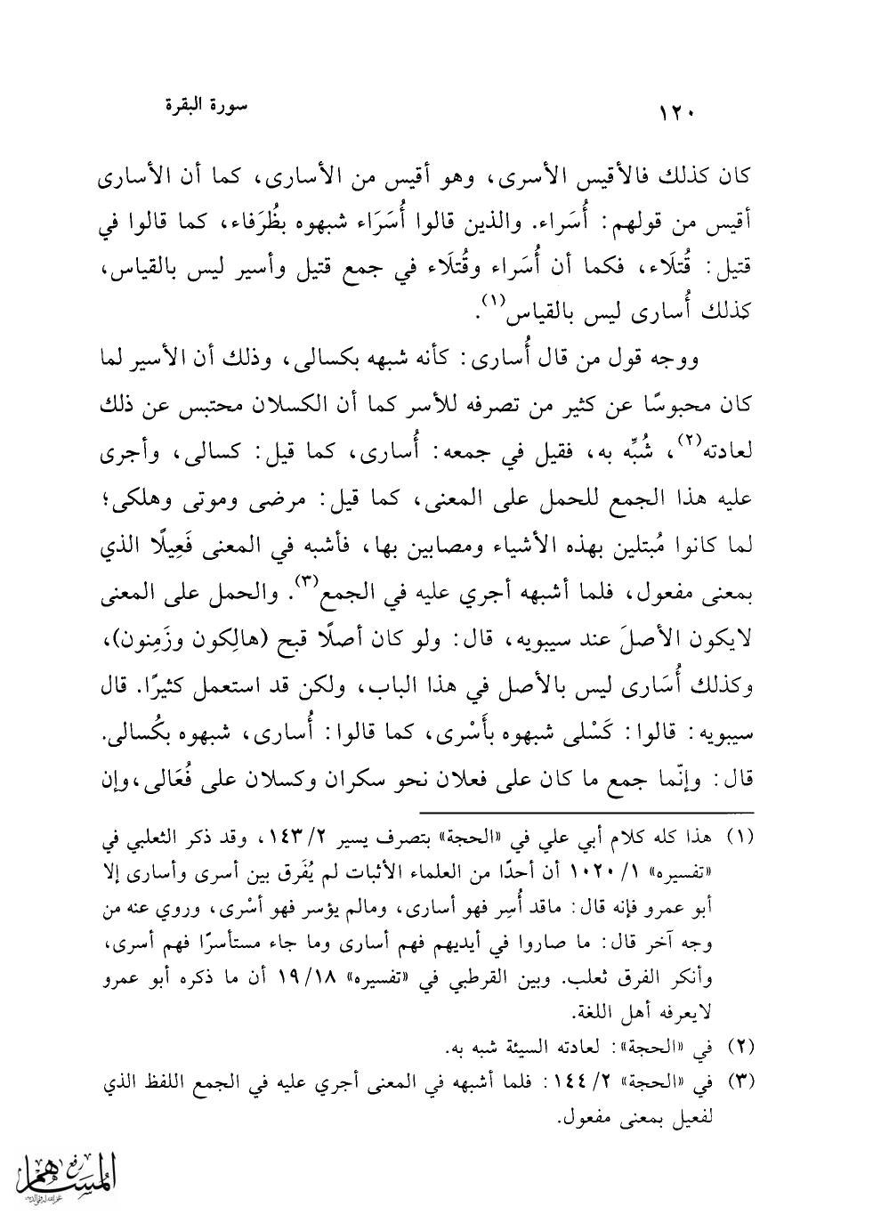 ووجه قول من قال أُسارى: كأنه شبهه بكسالى، وذلك أن الأسير لما كان محبوسًا عن كثير من تصرفه للأسر كما أن الكسلان محتبس عن ذلك لعادته (¬2)، شُبِّه به، فقيل في جمعه: أُسارى، كما قيل: كسالى، وأجرى عليه هذا الجمع للحمل على المعنى، كما قيل: مرضى وموتى وهلكى؛ لما كانوا مُبتلين بهذه الأشياء ومصابين بها، فأشبه في المعنى فَعِيلًا الذي بمعنى مفعول، فلما أشبهه أجري عليه في الجمع (¬3). والحمل على المعنى لا يكون الأصلَ عند سيبويه، قال: ولو كان أصلًا قبح (هالِكون وزَمِنون)، وكذلك أُسَارى ليس بالأصل في هذا الباب، ولكن قد استعمل كثيرًا. قال سيبويه: قالوا: كَسْلى شبهوه بأَسْرى، كما قالوا: أُسارى، شبهوه بكُسالى. قال: وإنّما جمع ما كان على فعلان نحو سكران وكسلان على فُعَالى، وإن