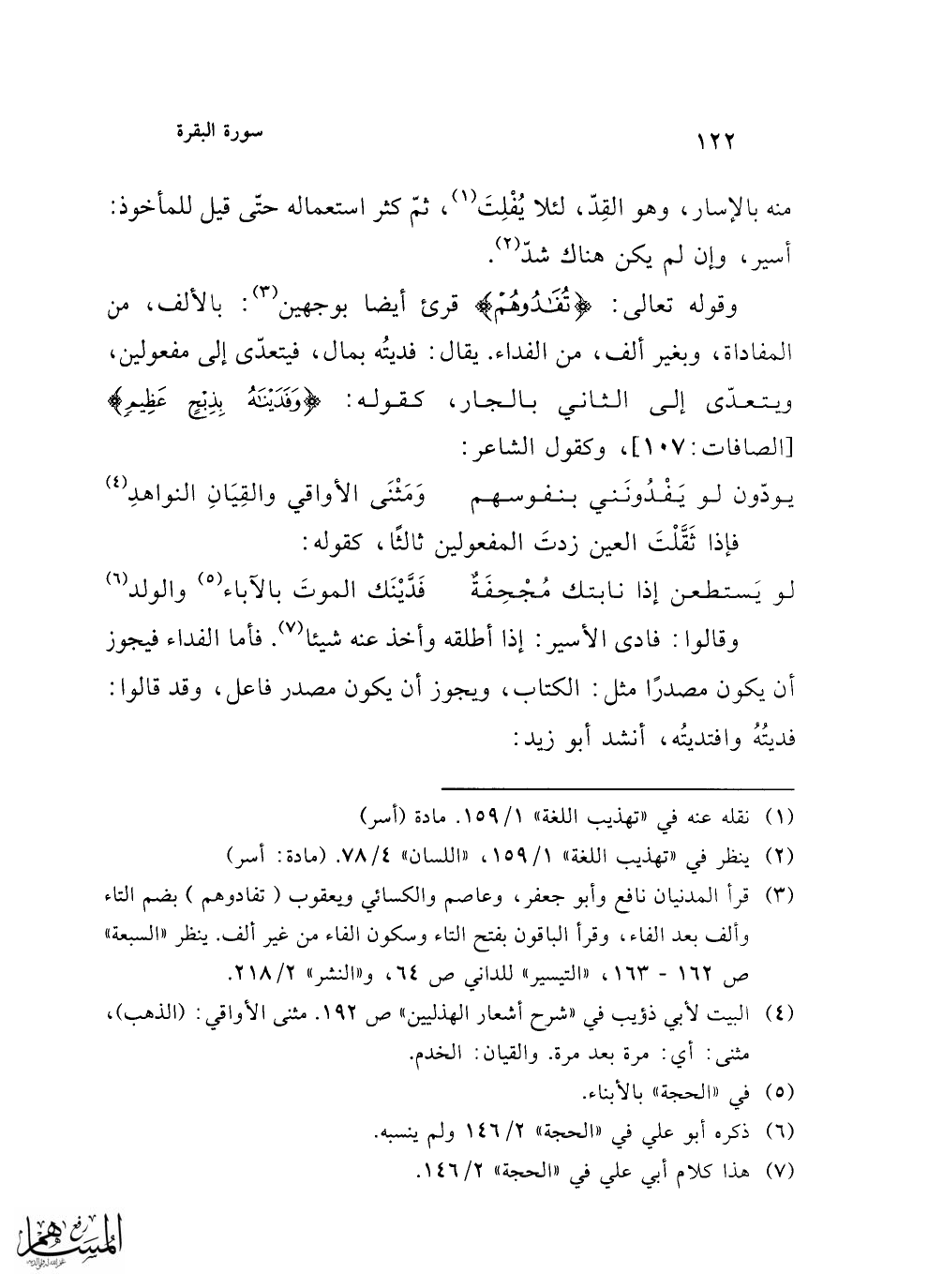 وقوله تعالى: {تُفَادُوهُم} قرئ أيضا بوجهين (¬3): بالألف، من المفاداة، وبغير ألف، من الفداء. يقال: فديتُه بمال، فيتعدّى إلى مفعولين، ويتعدّى إلى الثاني بالجار، كقوله: {وَفَدَينَاهُ بِذِبحٍ عَظِيمٍ} [الصافات: 107]، وكقول الشاعر: