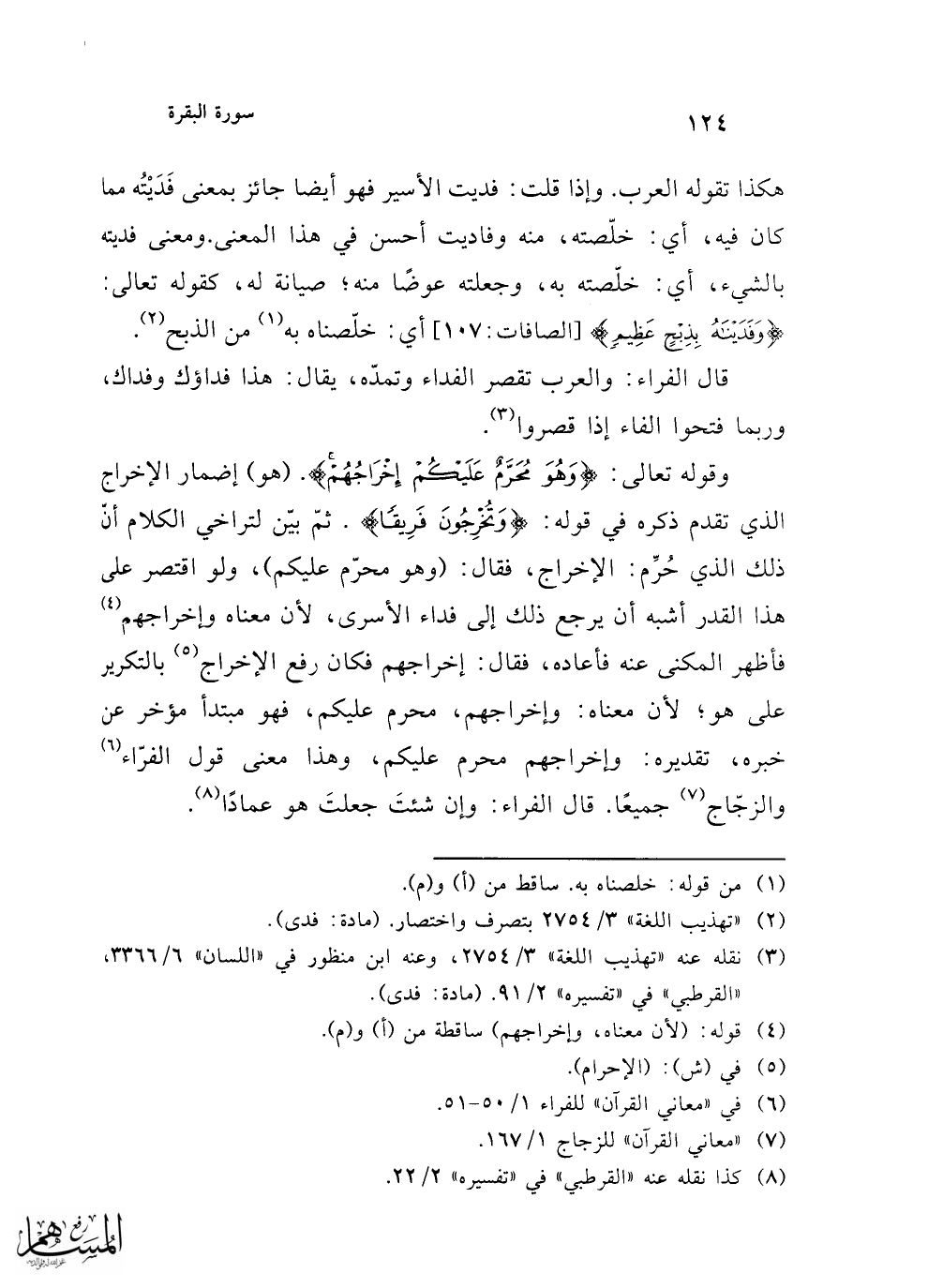 (¬3) نقله عنه "تهذيب اللغة" 3/ 2754، وعنه ابن منظور في "اللسان" 6/ 3366، "القرطبي" في "تفسيره" 2/ 91. (مادة: فدى).