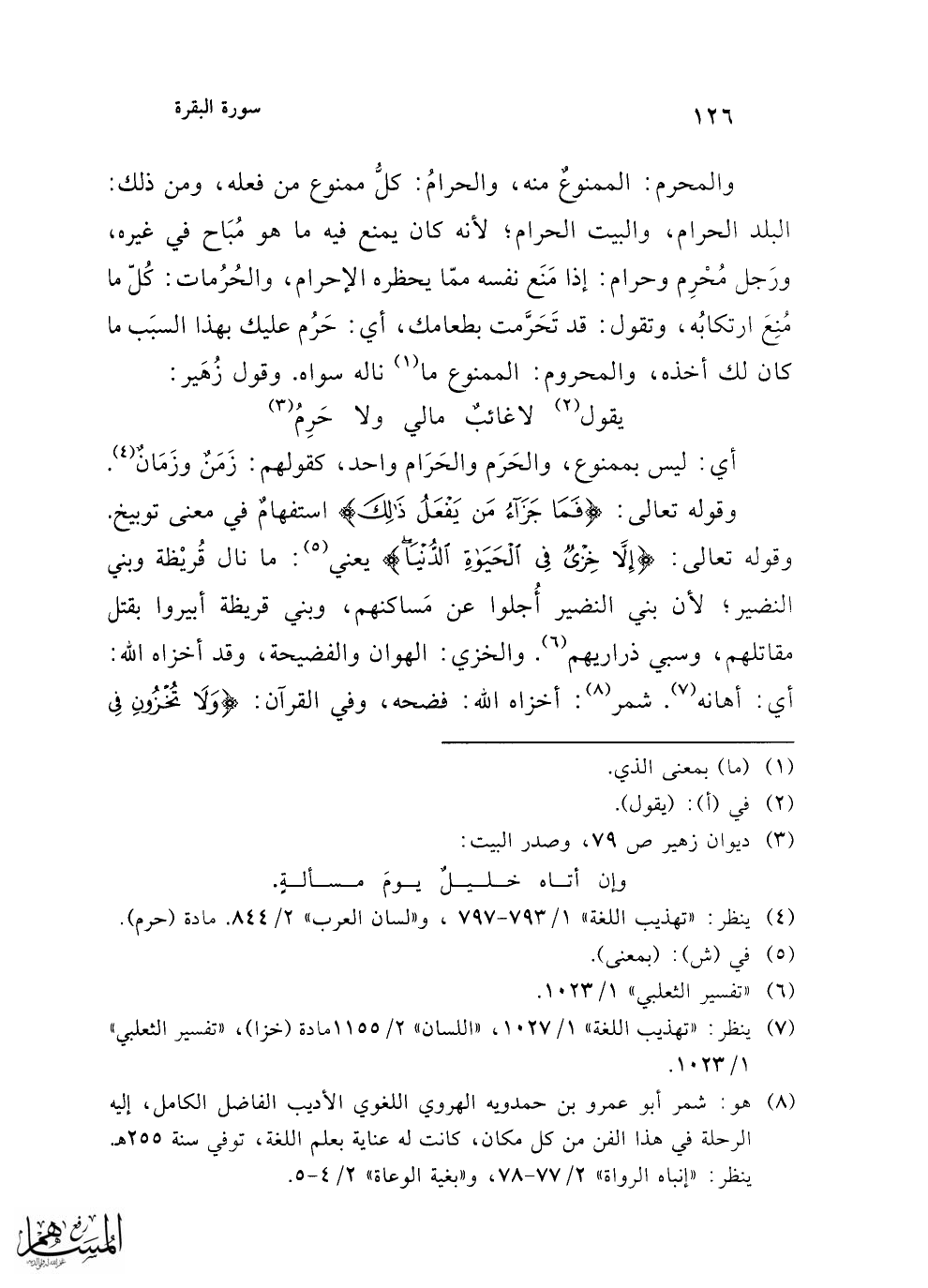 (¬7) ينظر: "تهذيب اللغة" 1/ 1027، "اللسان" 2/ 1155 مادة (خزا)، "تفسير الثعلبي" 1/ 1023.
