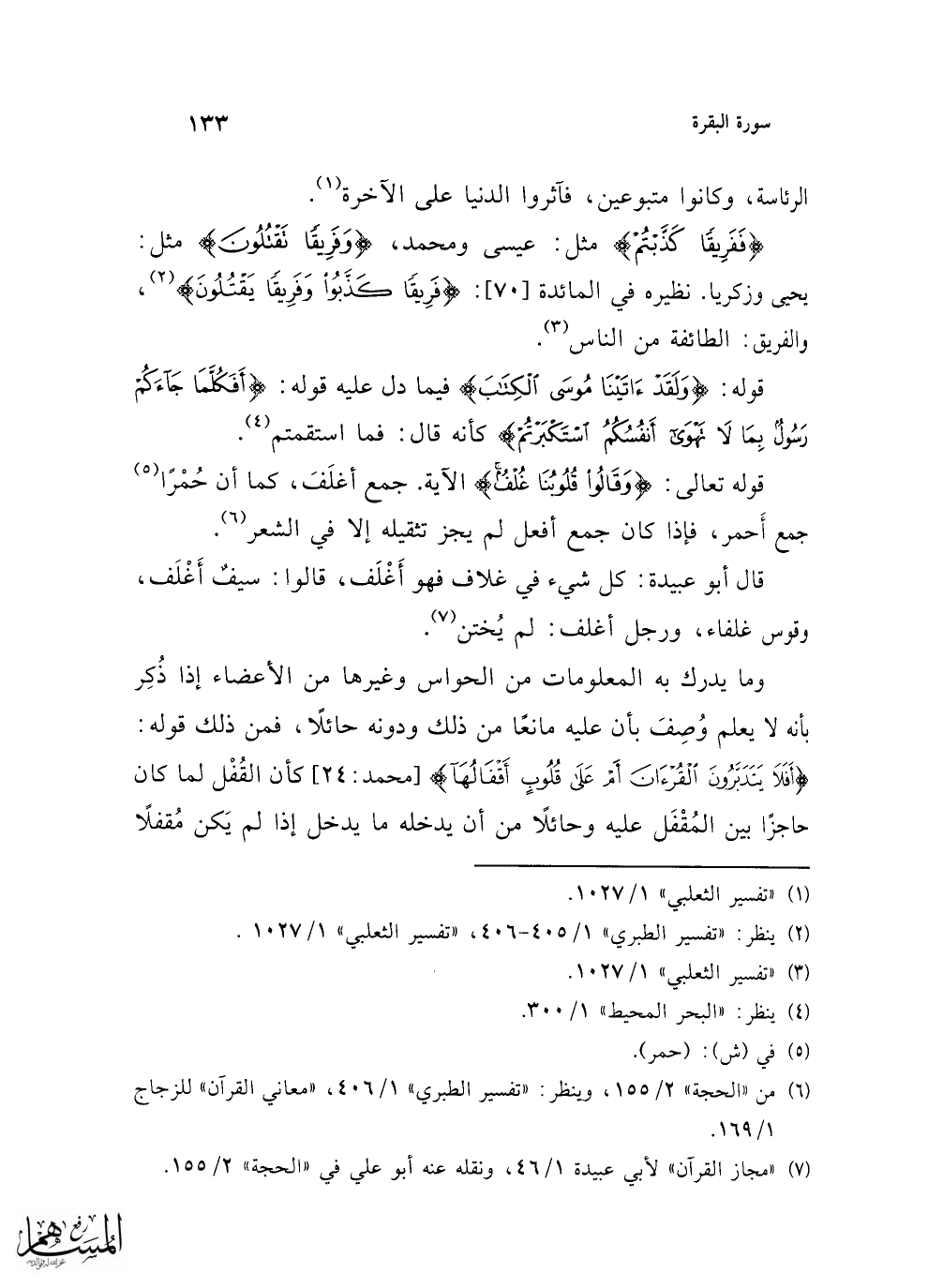 88 - قوله تعالى: {وَقَالُوا قُلُوُبنَا غُلْفُ} الآية. جمع أغلَفَ، كما أن حُمْرًا (¬5) جمع أَحمر، فإذا كان جمع أفعل لم يجز تثقيله إلا في الشعر (¬6).