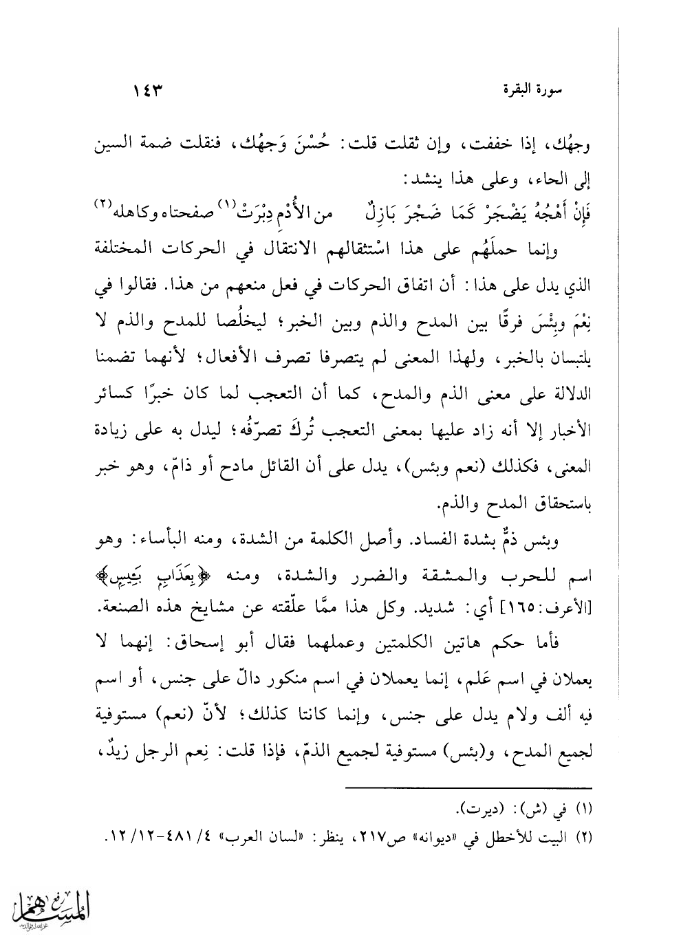 وإنما حملَهُم على هذا اسْتثقالهم الانتقال في الحركات المختلفة الذي يدل على هذا: أن اتفاق الحركات في فعل منعهم من هذا. فقالوا في نِعْمَ وبِئْسَ فرقًا بين المدح والذم وبين الخبر؛ ليخلُصا للمدح والذم لا يلتبسان بالخبر، ولهذا المعنى لم يتصرفا تصرف الأفعال؛ لأنهما تضمنا الدلالة على معنى الذم والمدح، كما أن التعجب لما كان خبرًا كسائر الأخبار إلا أنه زاد عليها بمعنى التعجب تُركَ تصرّفُه؛ ليدل به على زيادة المعنى، فكذلك (نعم وبئس)، يدل على أن القائل مادح أو ذامّ، وهو خبر باستحقاق المدح والذم.