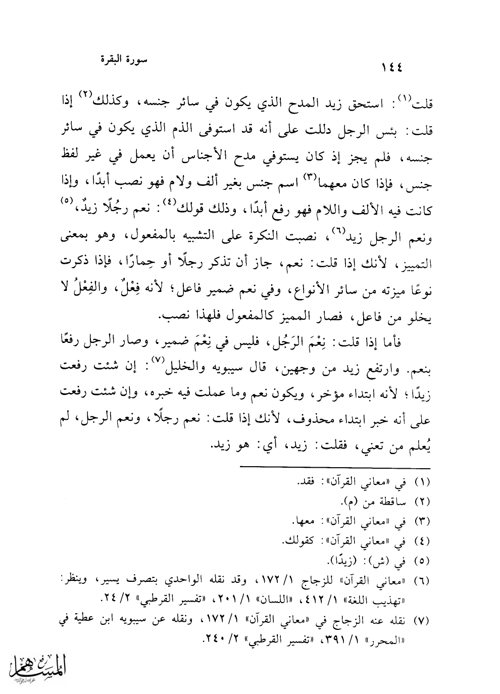 (¬7) نقله عنه الزجاج في "معاني القرآن" 1/ 172، ونقله عن سيبويه ابن عطية في "المحرر" 1/ 391، "تفسير القرطبي" 2/ 240.